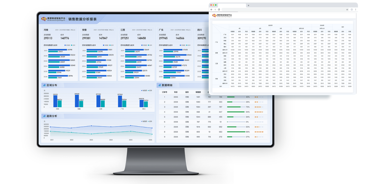 深度对接MOM、MES、ERP及SRM等系统,消除数据孤岛;通过拖拽方式快速建立多维交叉数据透视表,实现动态钻取和数据联动,提升数据分析效率,赋能构建企业级统一数据视图。